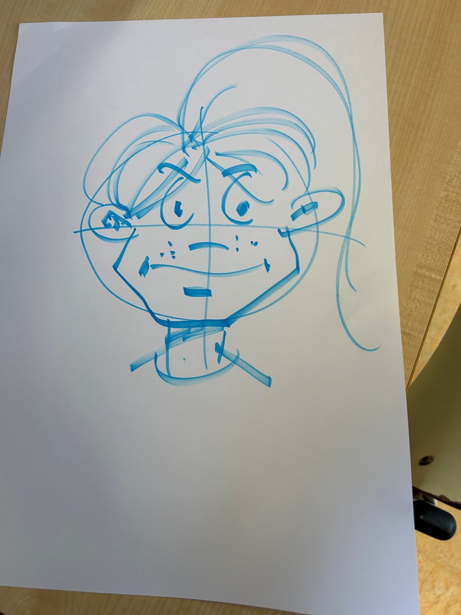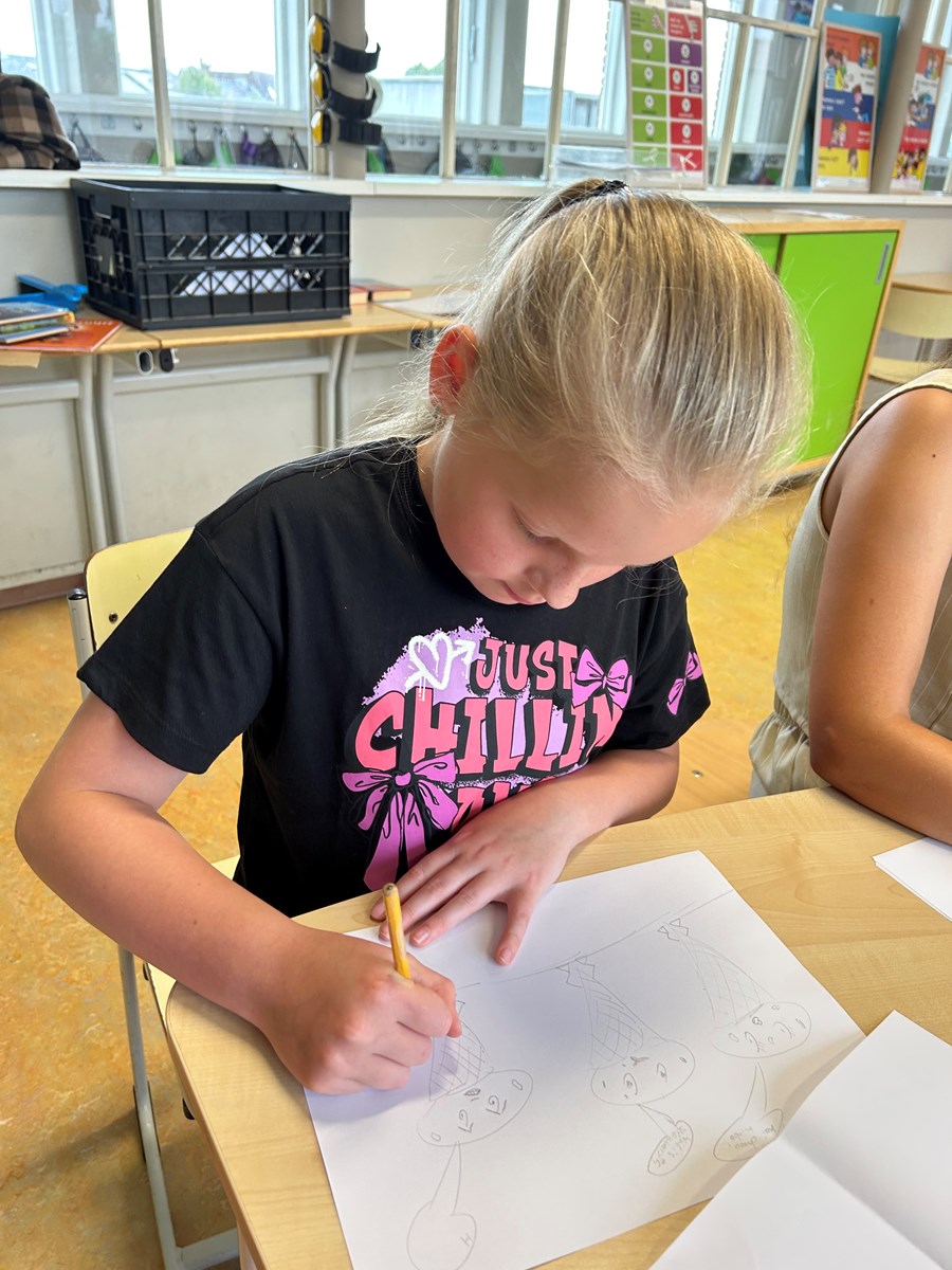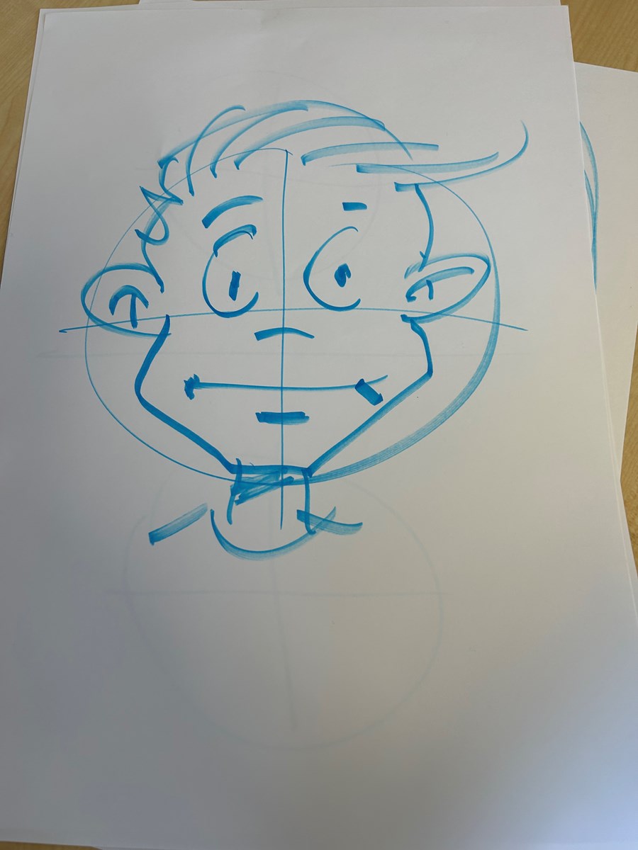 Hij kan vertellen over zijn werk maar kwam ons ook leren tekenen. De basis is een cirkel met lijnen. Vanuit daar kun je verschillende personages creëren met een kleine aanpassing. Ook mochten we eigen figuren maken. Speciaal voor ons had hij ook nog een tekening gemaakt over een bitterbal, kroket en zak patat. Zij laten emoties zien en praten met elkaar.