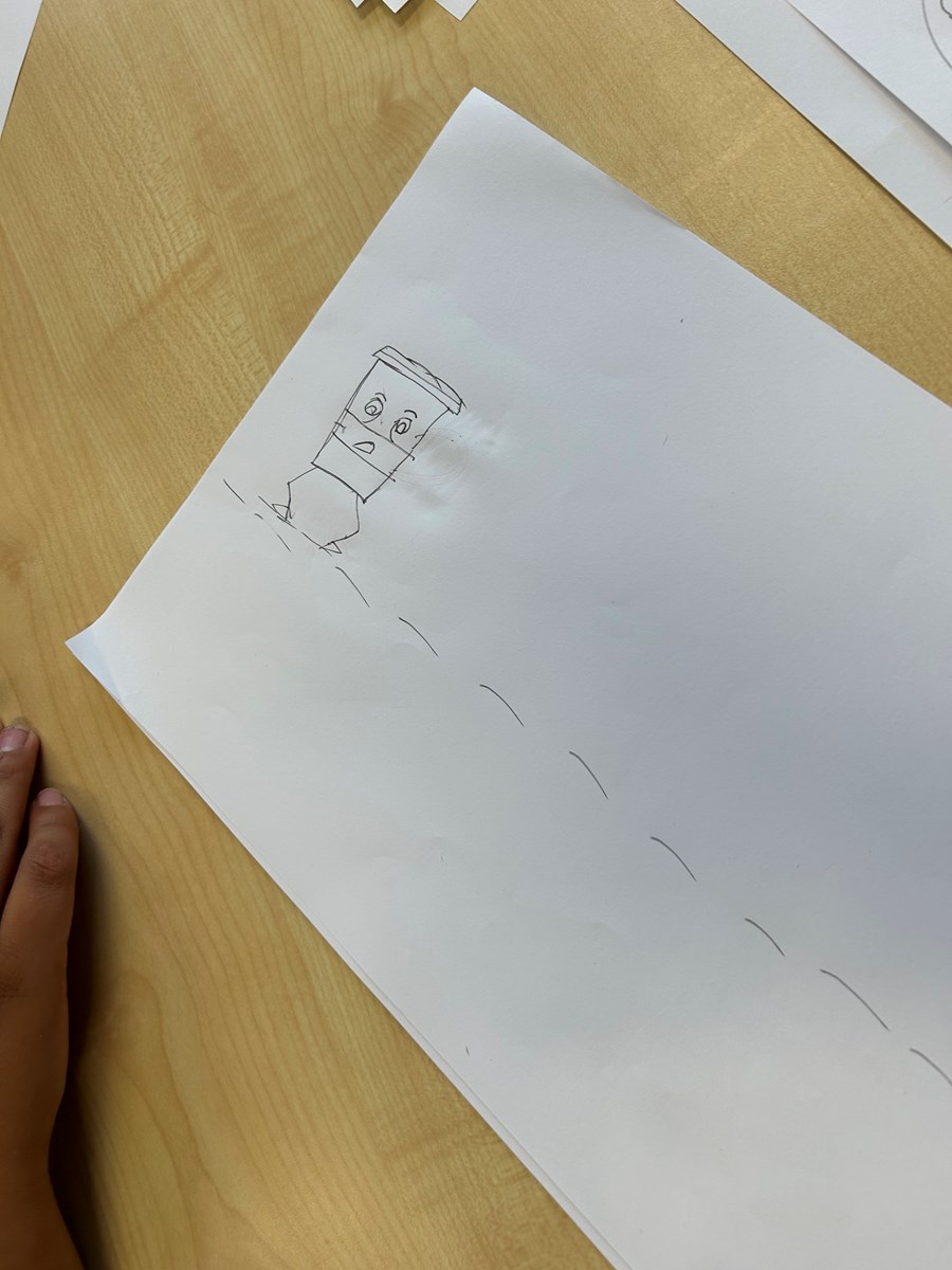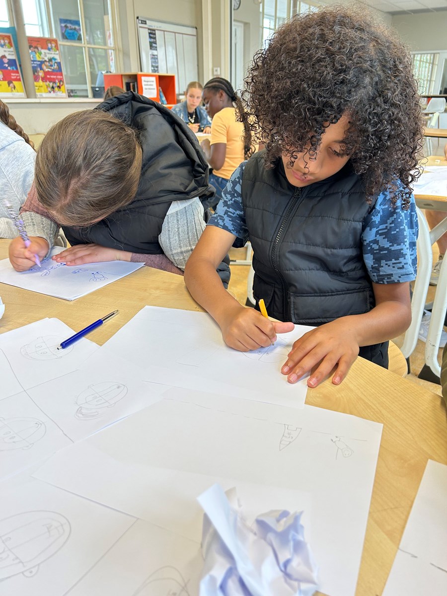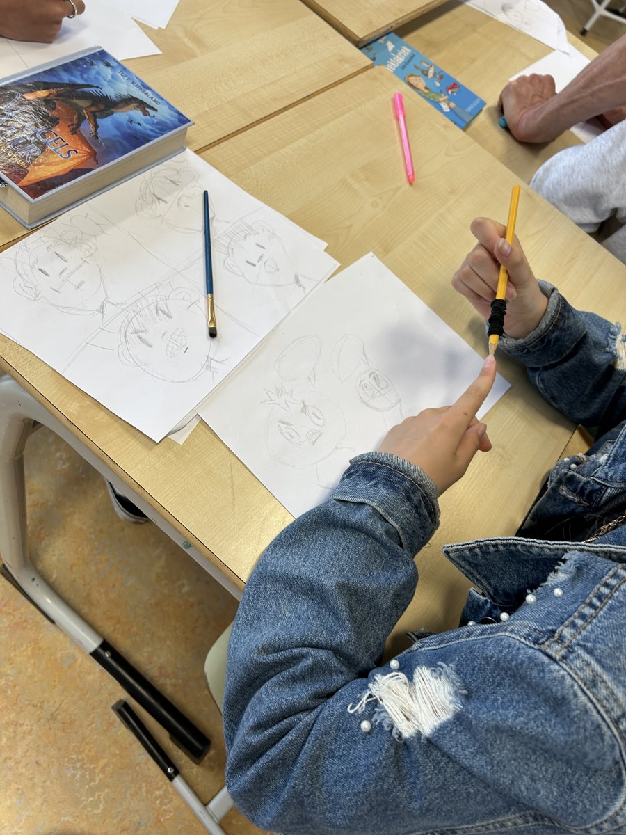 Hij kan vertellen over zijn werk maar kwam ons ook leren tekenen. De basis is een cirkel met lijnen. Vanuit daar kun je verschillende personages creëren met een kleine aanpassing. Ook mochten we eigen figuren maken. Speciaal voor ons had hij ook nog een tekening gemaakt over een bitterbal, kroket en zak patat. Zij laten emoties zien en praten met elkaar.