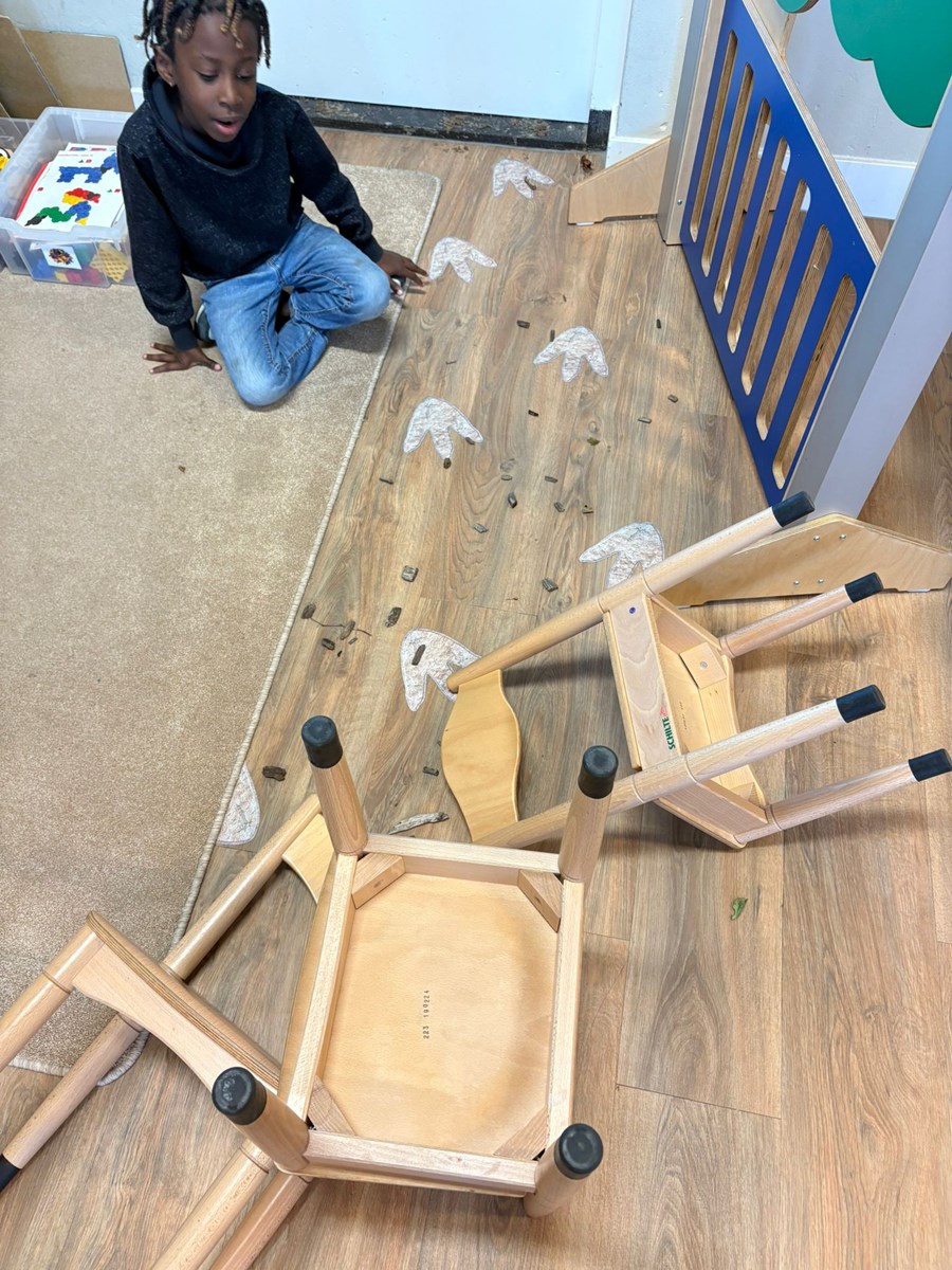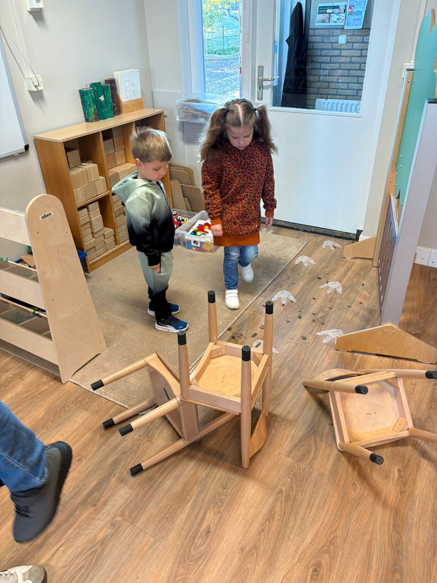 Vanmorgen vroeg was er wel iets heel raars gebeurd. In de klas waren pootafdrukken te zien, er lagen stoelen om en er lag allemaal zand, takjes en steentjes in de klas. Wie is hier binnen geweest?? Was dit een grote dino of een kleine? Daniel zijn hand was te klein, dus de dino is groter dan Daniel. Meester Yoram heeft wel de grootste handen van de school, dus die heeft Haroun even opgehaald. Maaaaar... De dinopoot was kleiner. Conclusie: hij is kleiner dan meester Yoram, maar groter dan de kinderen.