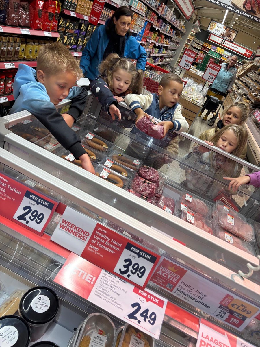 Hoe komen we daar nu toch achter? Het idee kwam om 2 bordjes neer te zetten met eten. Eén gevuld met blaadjes en de ander met vlees. We hebben in de koelkast gekeken, maar geen vlees. Waar kunnen we dit halen? Bij de VOMAR! We zijn dus met zijn allen naar de Vomar gelopen om sla en vlees te halen. We hebben prijzen bekeken, want juf had een briefje van 10 euro mee en wat muntjes. Het mooie stuk vlees van €36,75 was dus een beetje te duur. Op zoek naar iets anders.