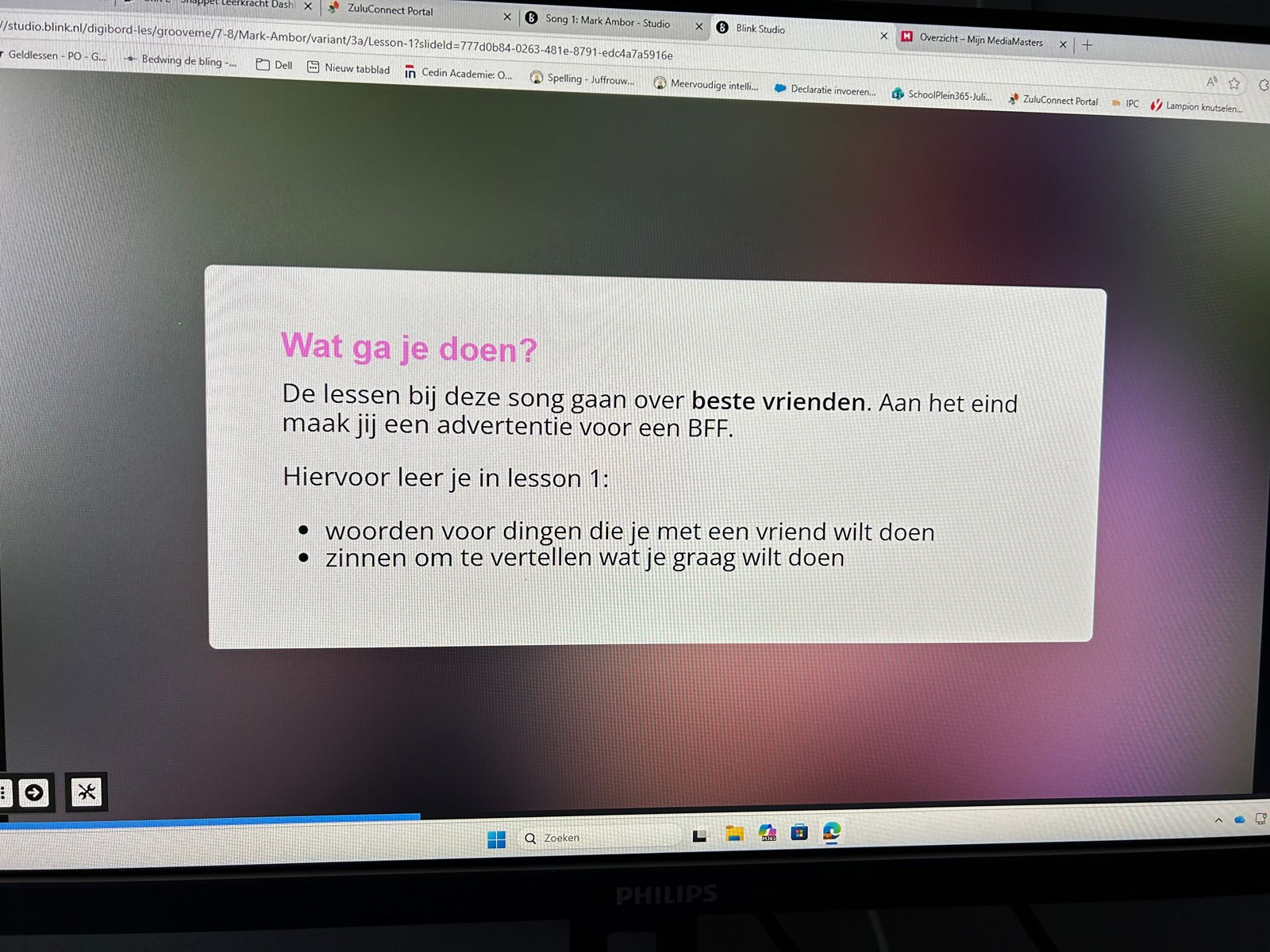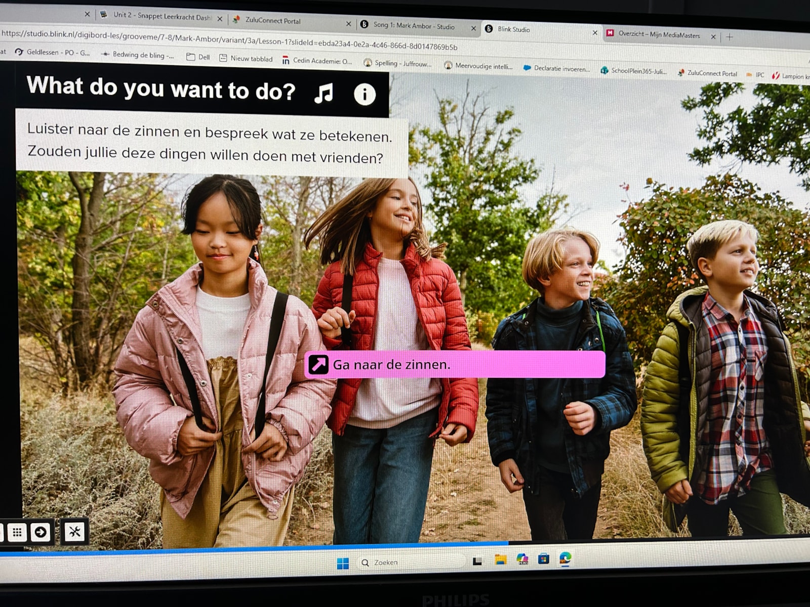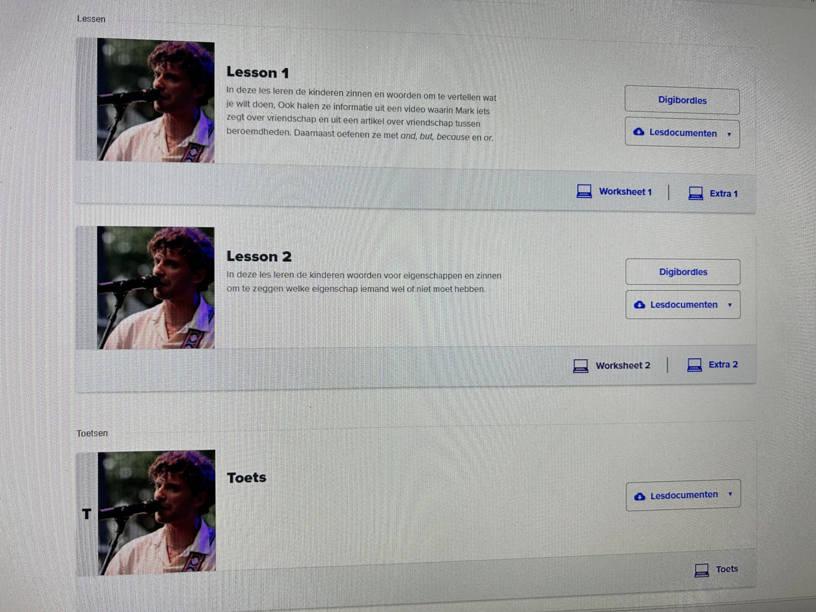 Groep 5-6 en 7-8 krijgen op eigen niveau les. De opbouw van de les is afwisselend: werken met de songtekst, zinnen uitspreken, luisteren in het Engels. Een song heeft twee lessen. Daarna sluiten we de les af met een toets. Elke 3 weken is er een nieuwe song.