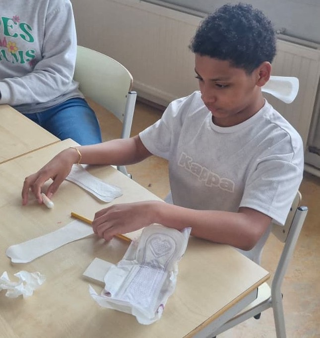 De tweede dag hebben we het ook gehad over menstruatie. Bij het binnenkomen in het lokaal lagen er inlegkruisjes, maandverband en tampons op tafel. De kinderen mochten deze bekijken en onderzoeken. Zo konden ze bijvoorbeeld kijken hoe het plakrandje werkt en of het niet te veel plakt, en of het draadje van een tampon wel stevig genoeg is.