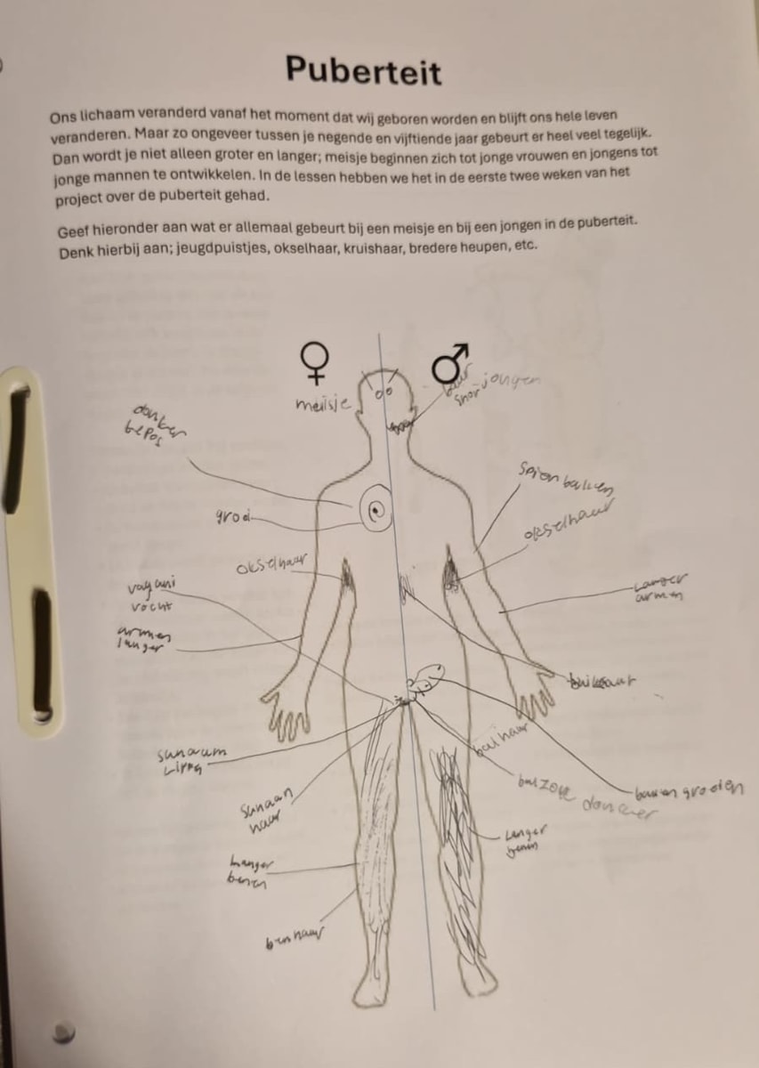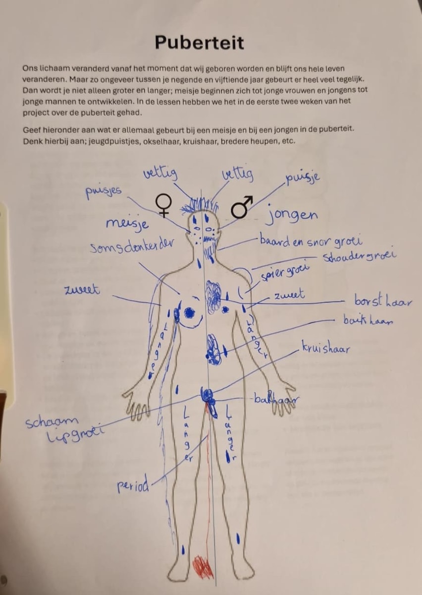 De kinderen hebben daarna een werkblad gemaakt waarbij ze gingen tekenen welke veranderingen er allemaal kunnen plaatsvinden bij jongens en meisjes in de puberteit.