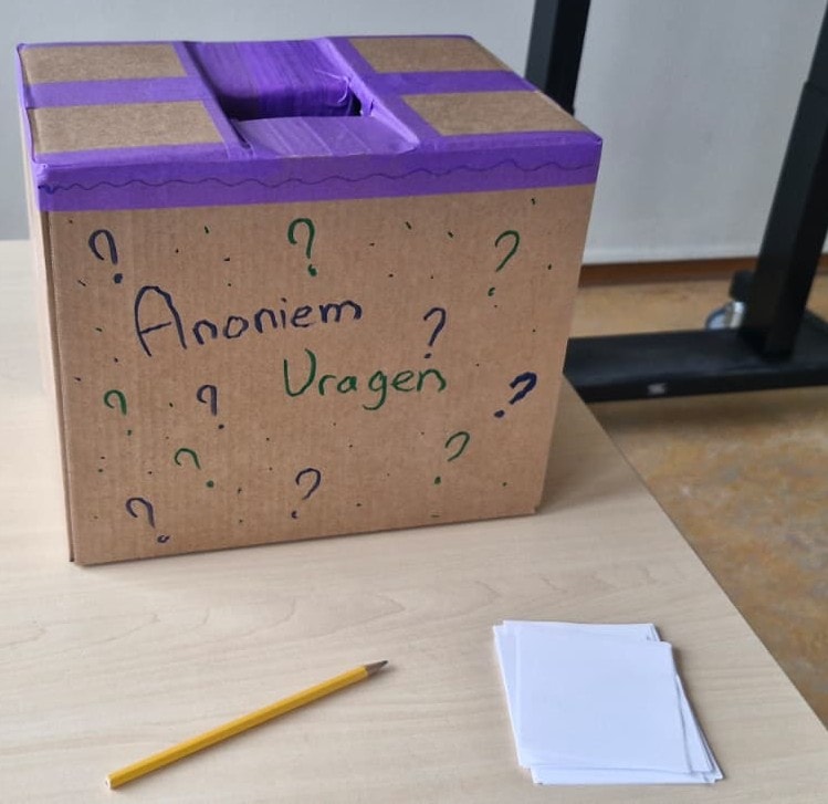 Daarnaast staat er nu ook een anonieme vragenbox in de klas. Hier kunnen de kinderen vragen in stoppen die ze misschien wel hebben, maar niet hardop durven of willen stellen in de klas. De vragen worden later door ons gelezen en we beantwoorden ze vervolgens in de groep.
